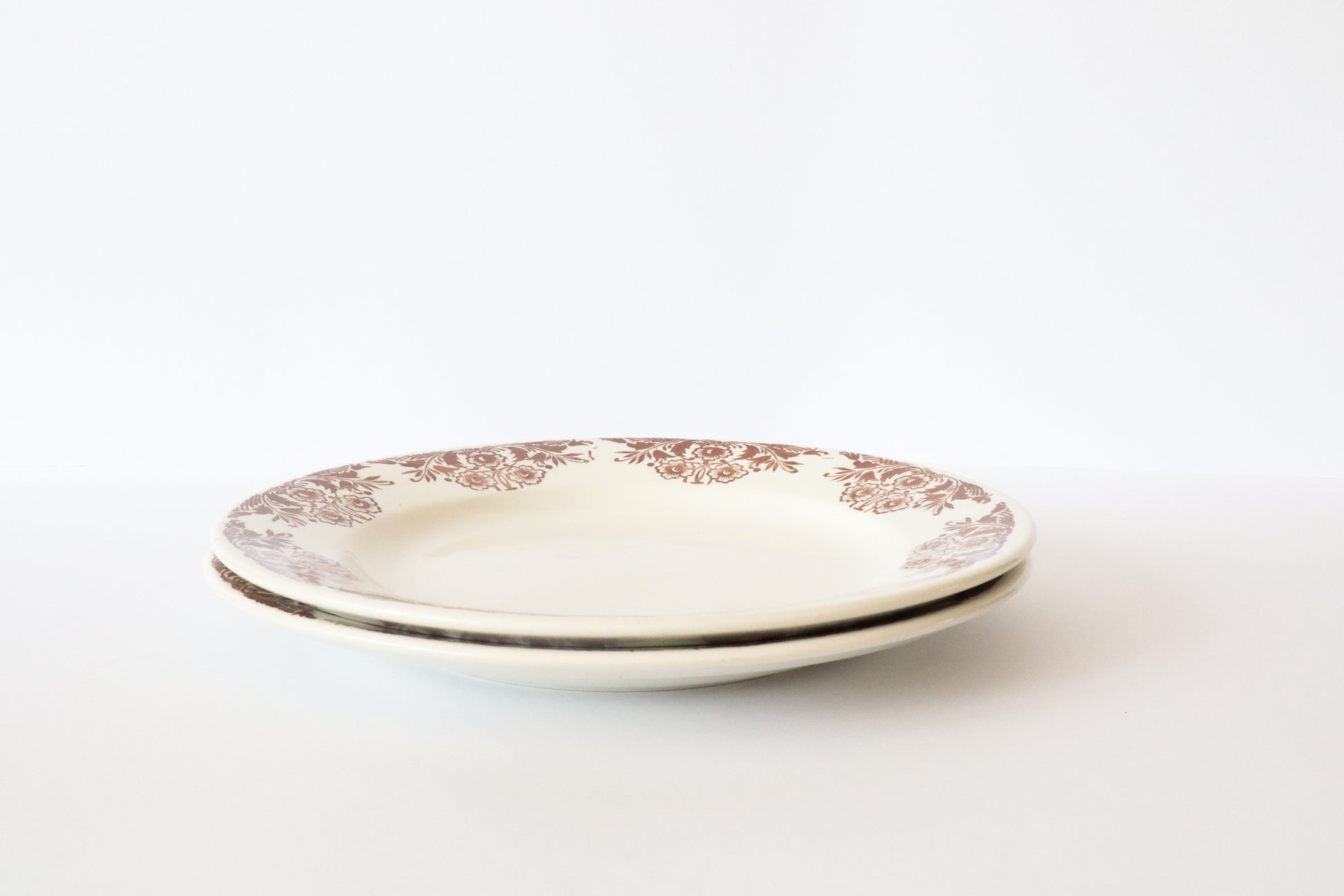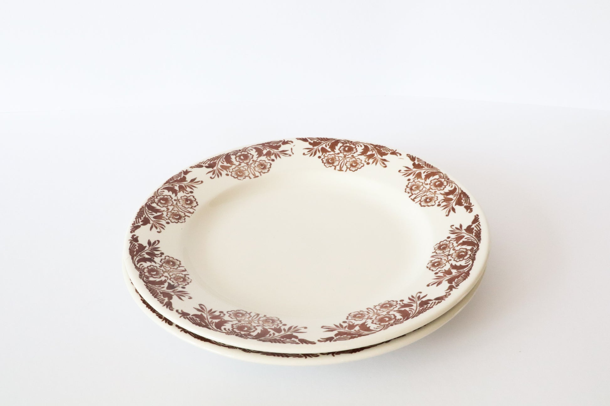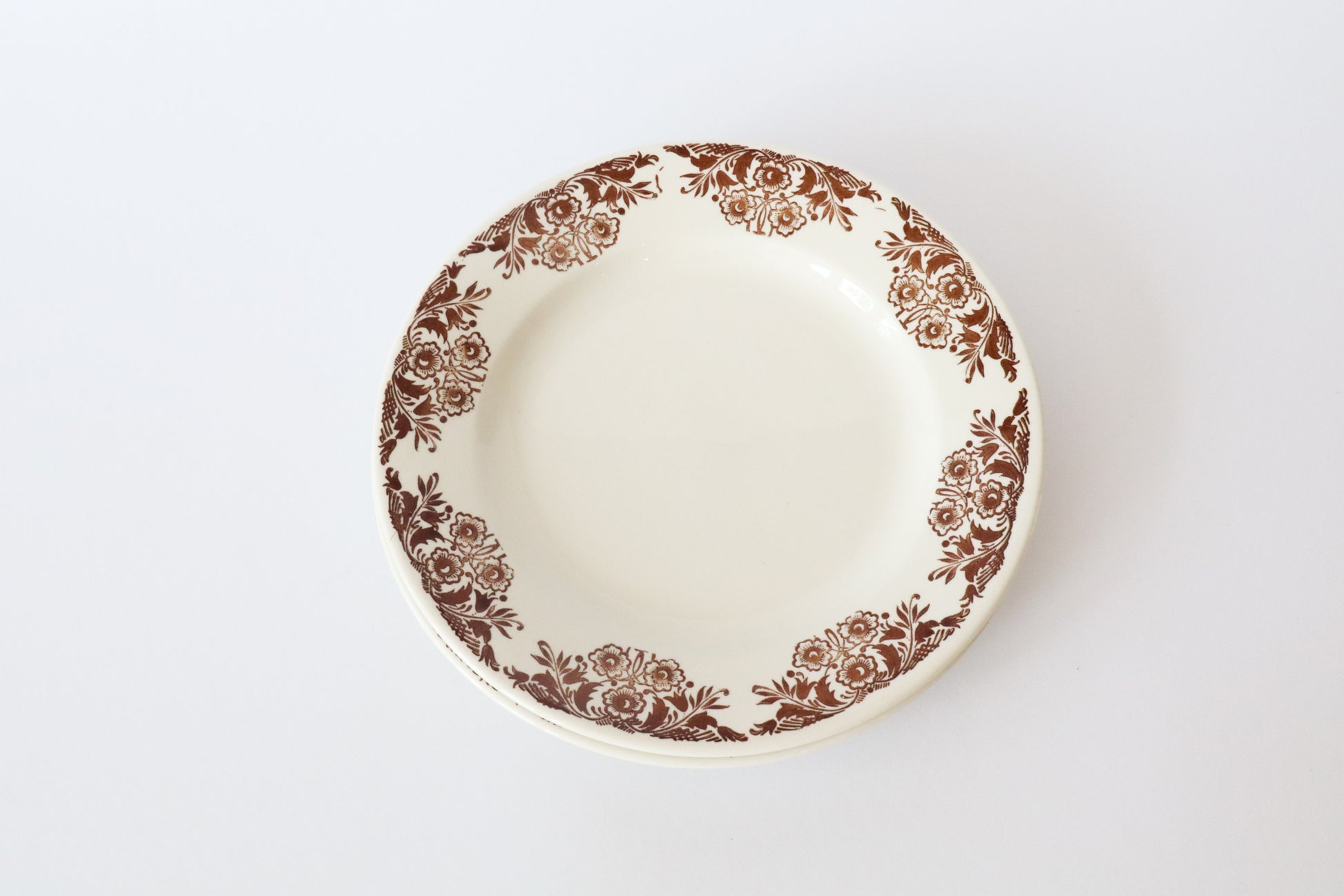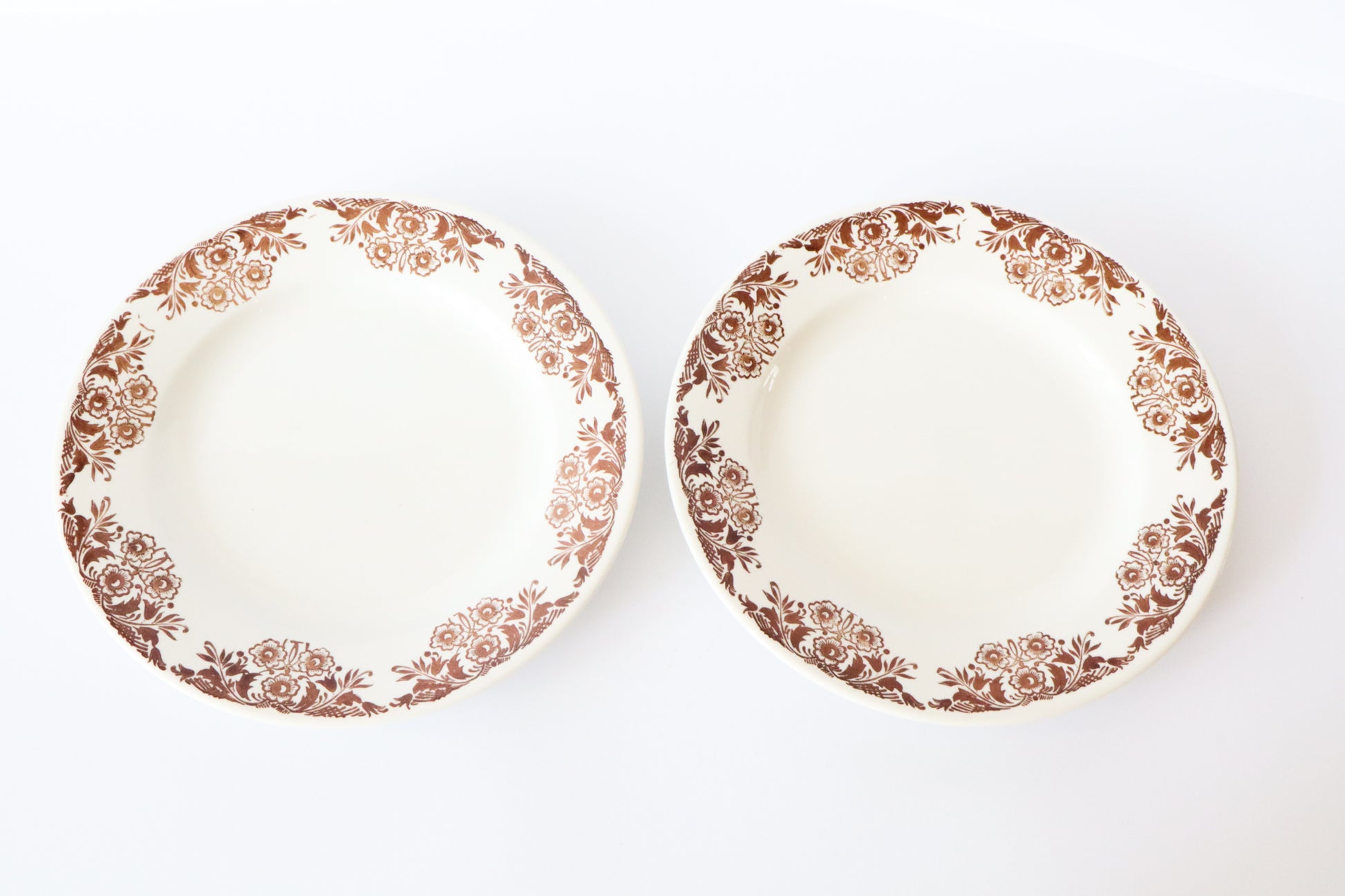 Witte ontbijtborden met sierlijke bruine bloemen langs de rand. Klassieke uitstraling.