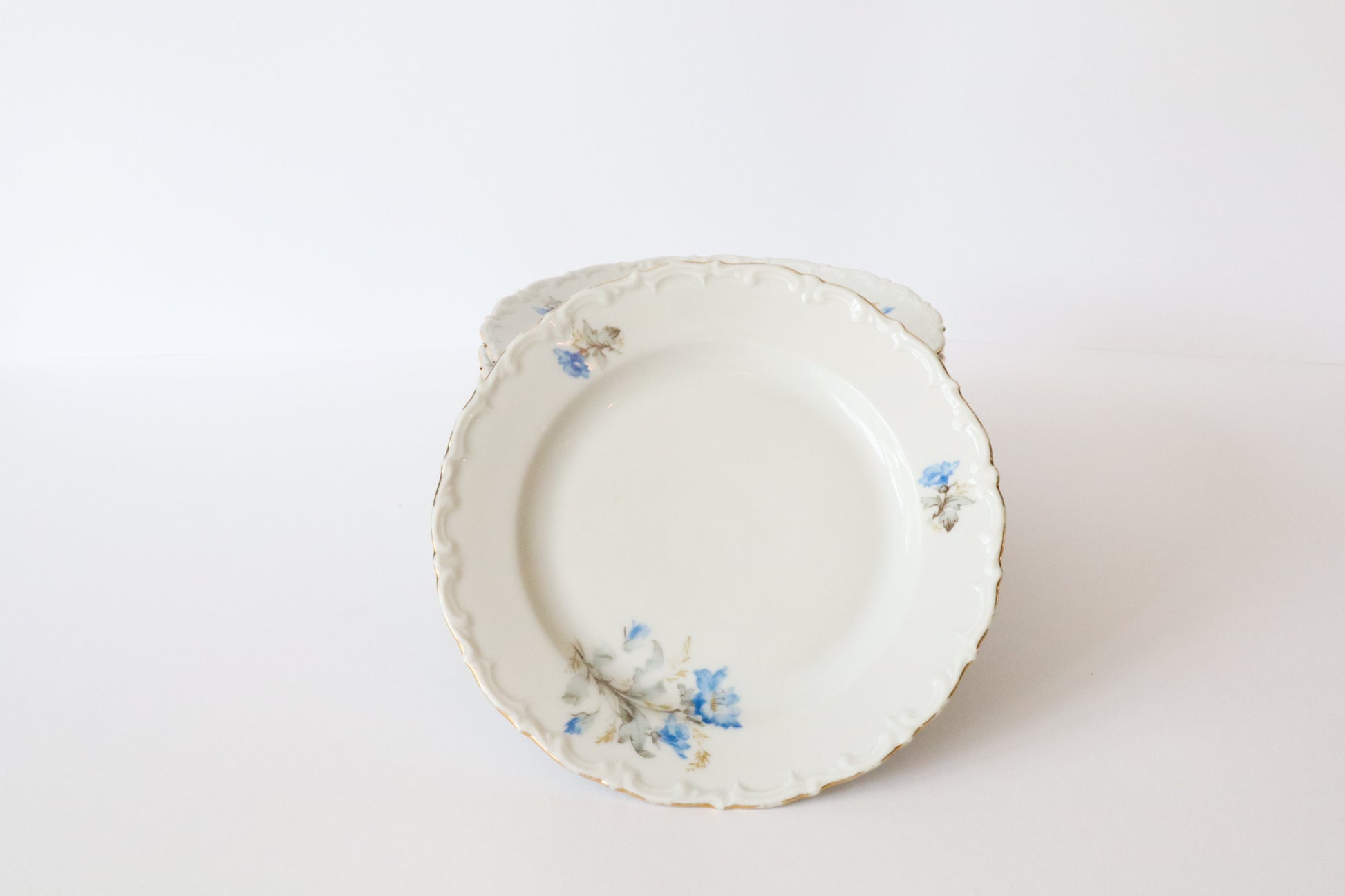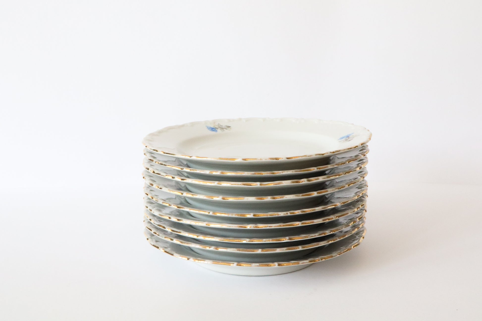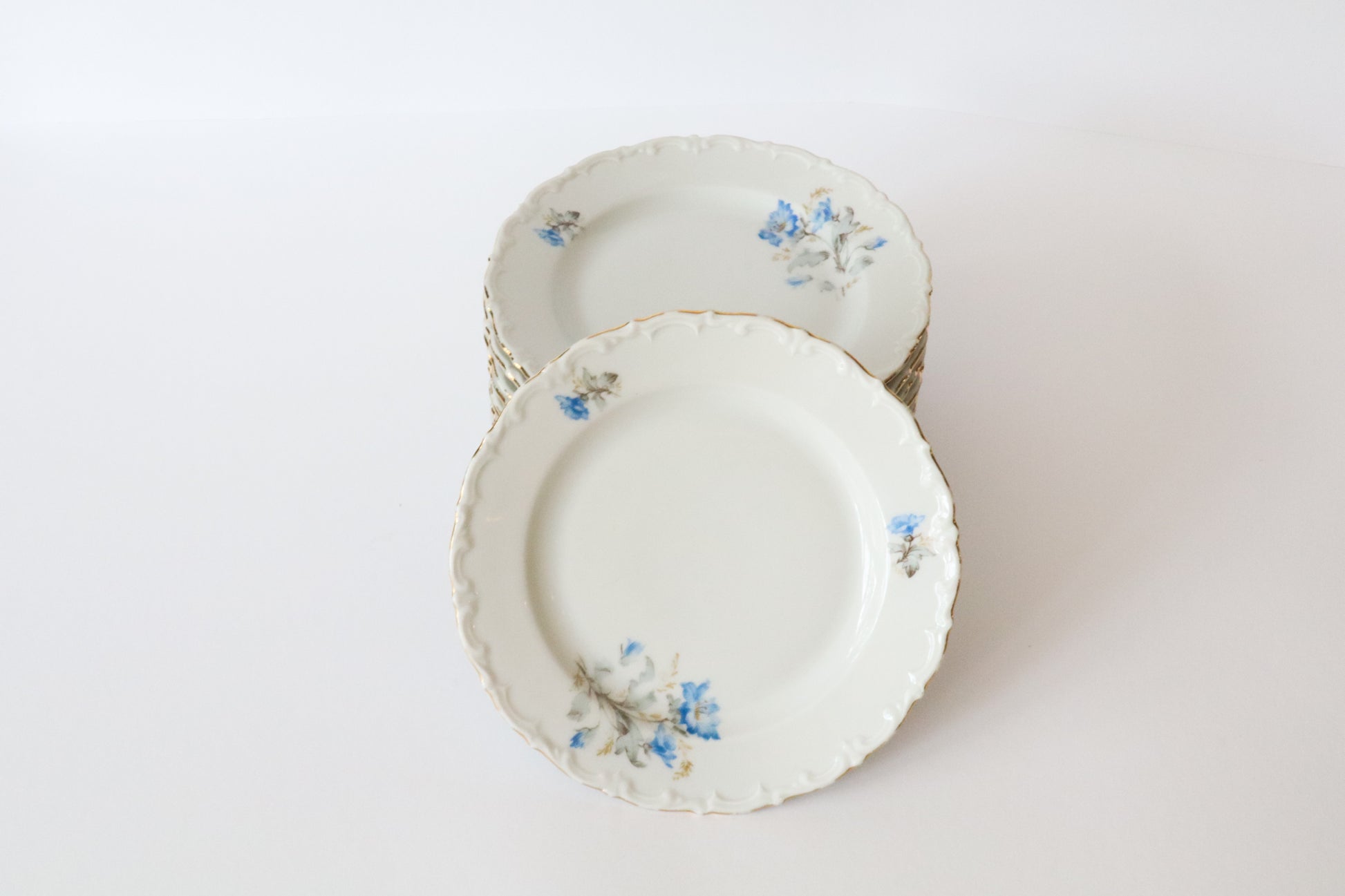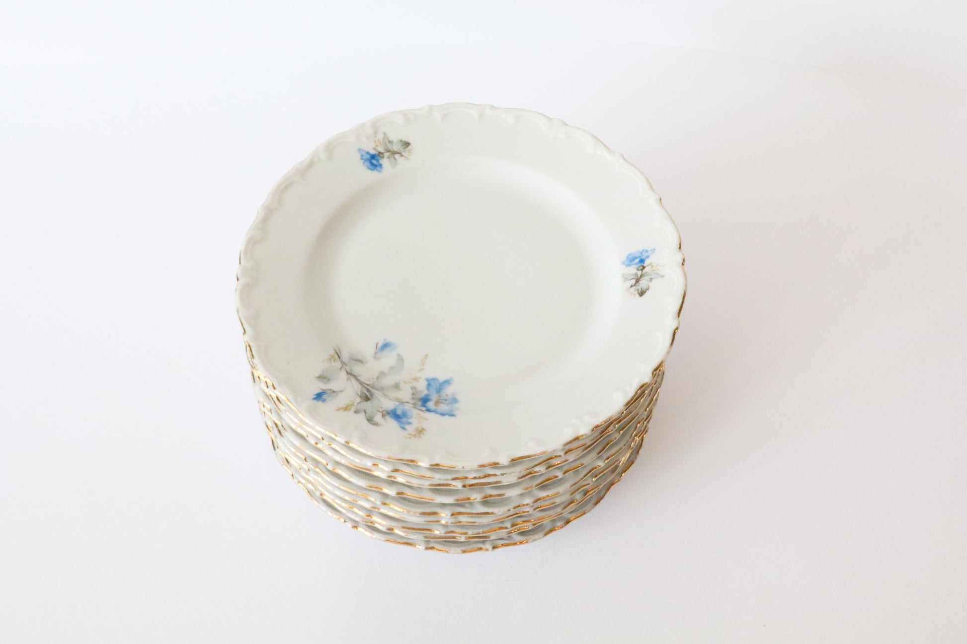 Set van 9 gebaksbordjes met bloemen en gewerkte rand.
