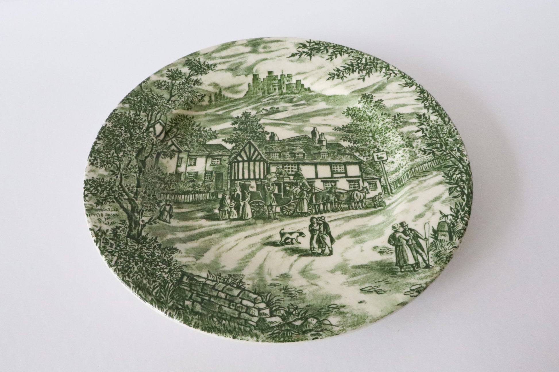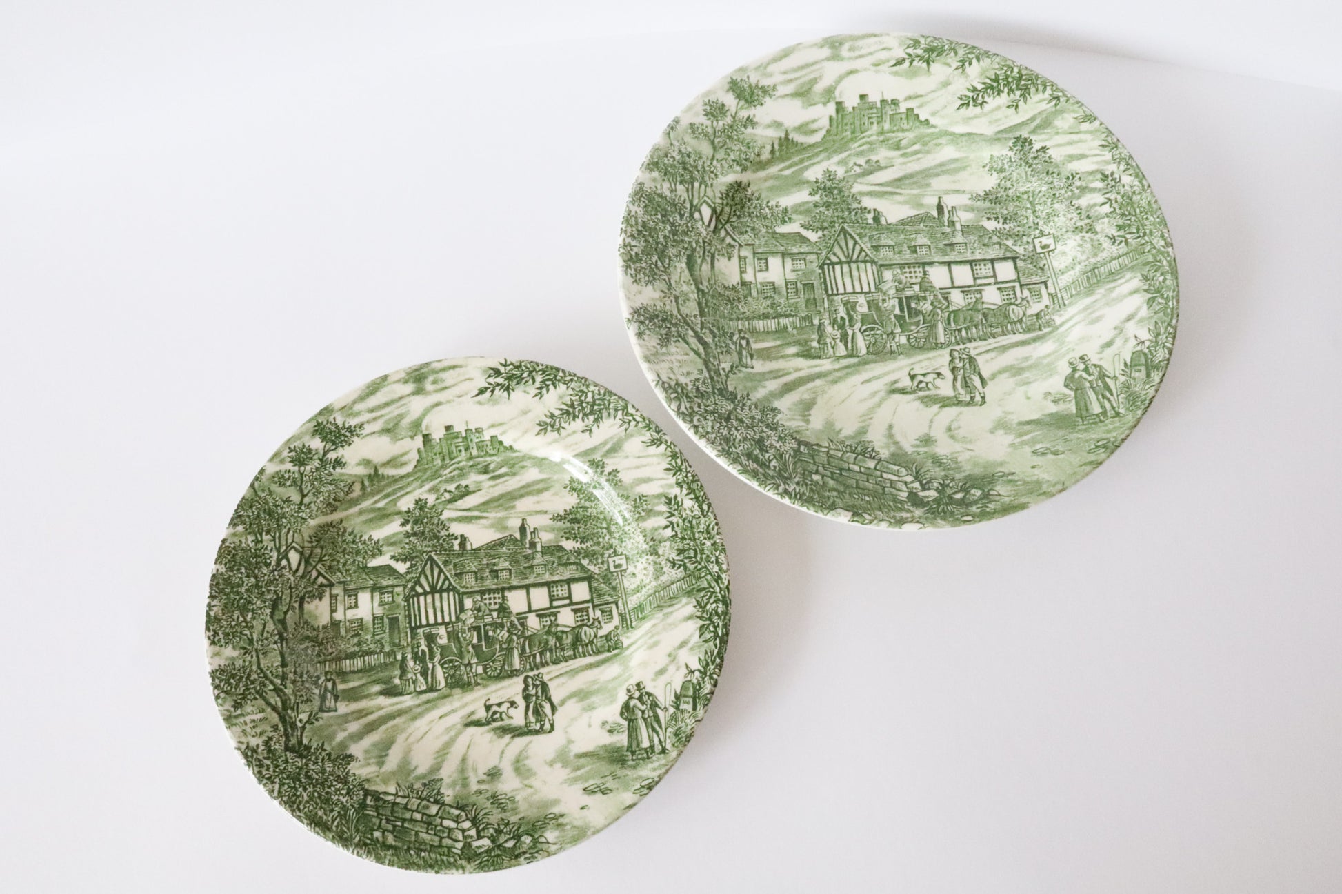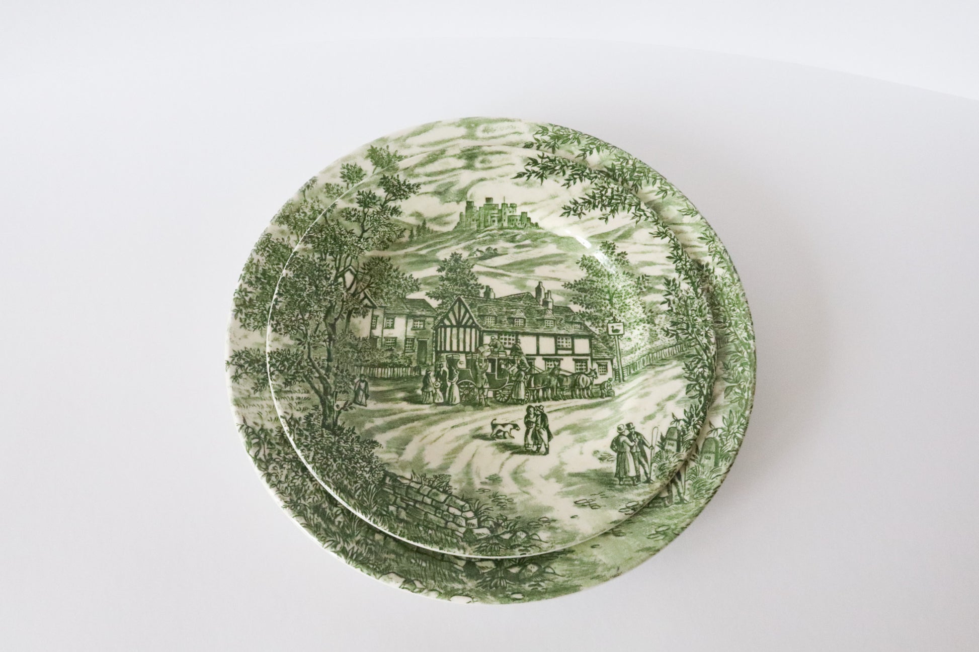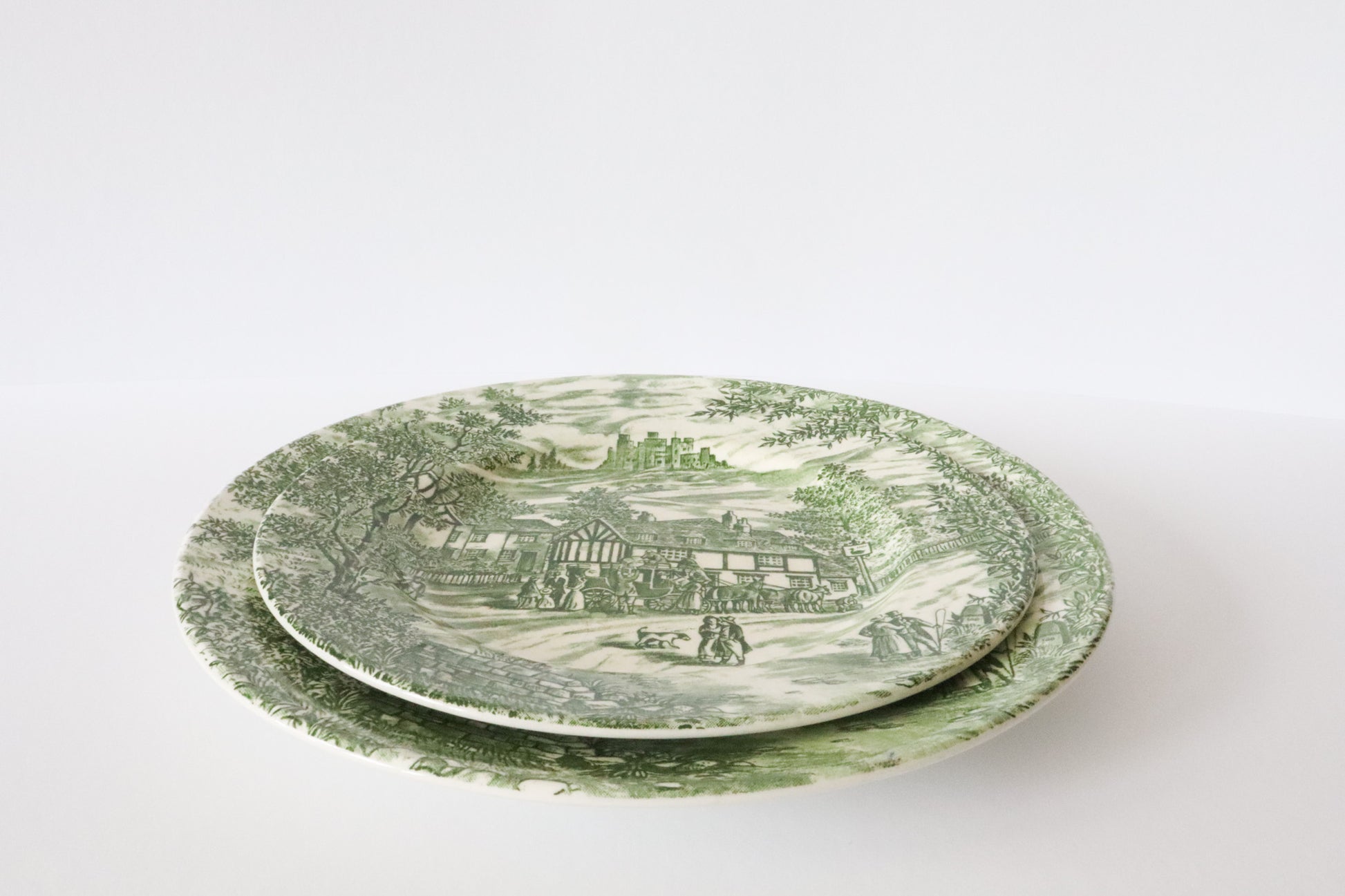 Set van ontbijtbord en dinerbord met klassiek Engels dorpsbeeld in groene print. Perfect voor een nostalgisch gedekte tafel.