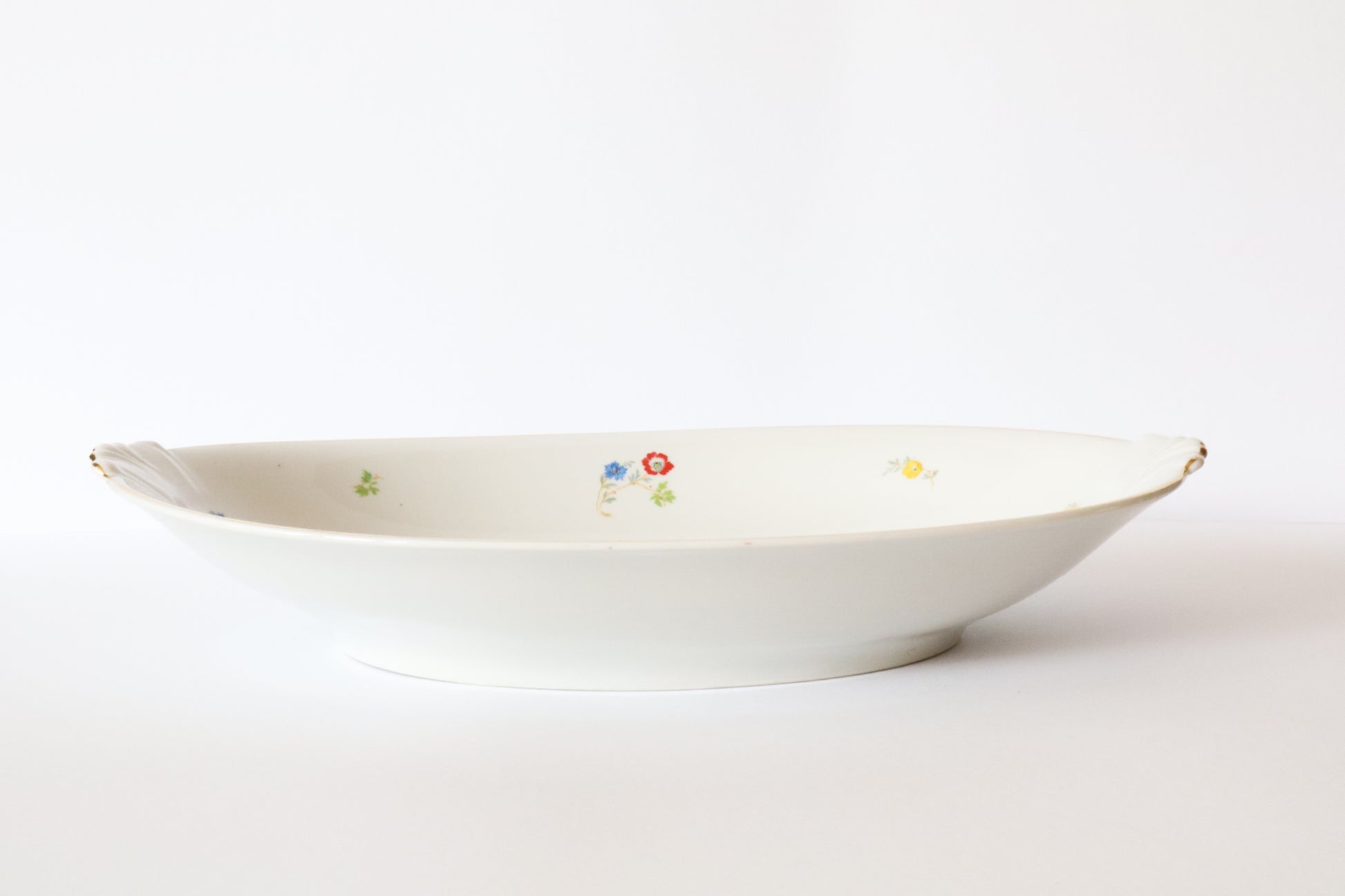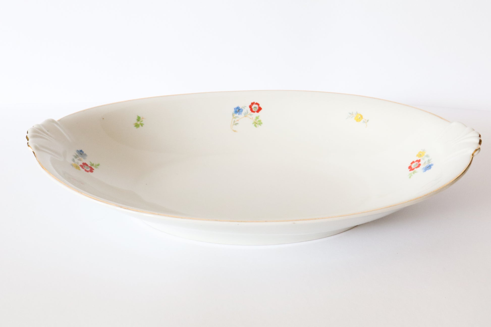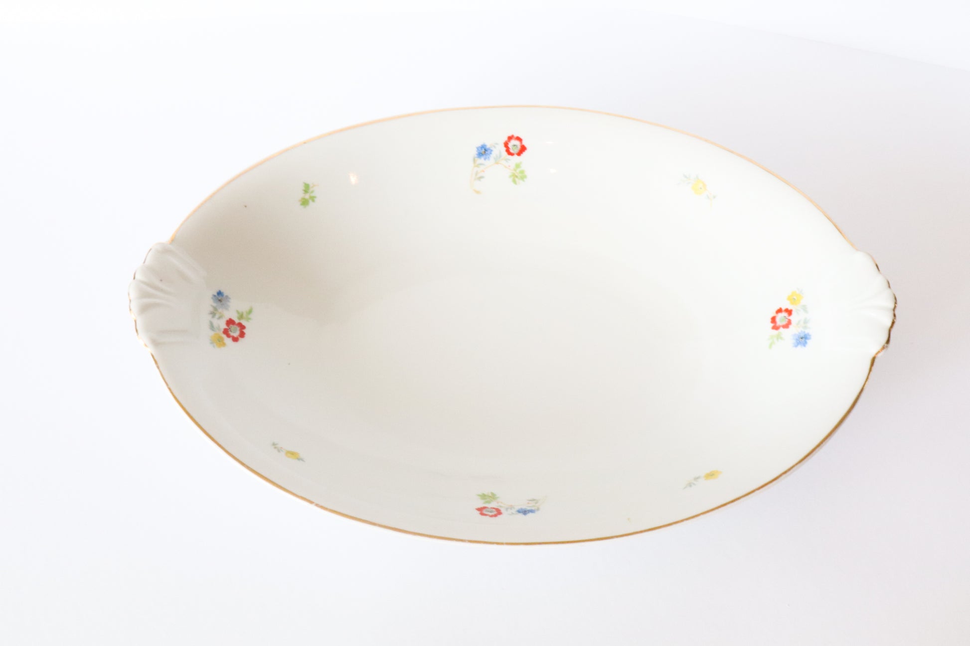 Fijne serveerschaal met speelse bloemetjes en goudaccent langs de rand. Handvatten met reliëf.