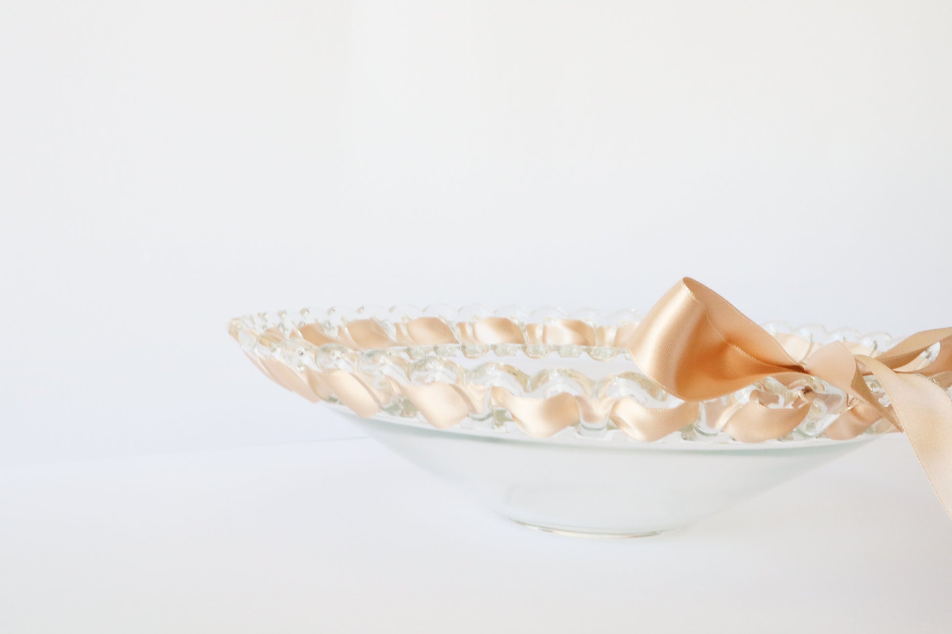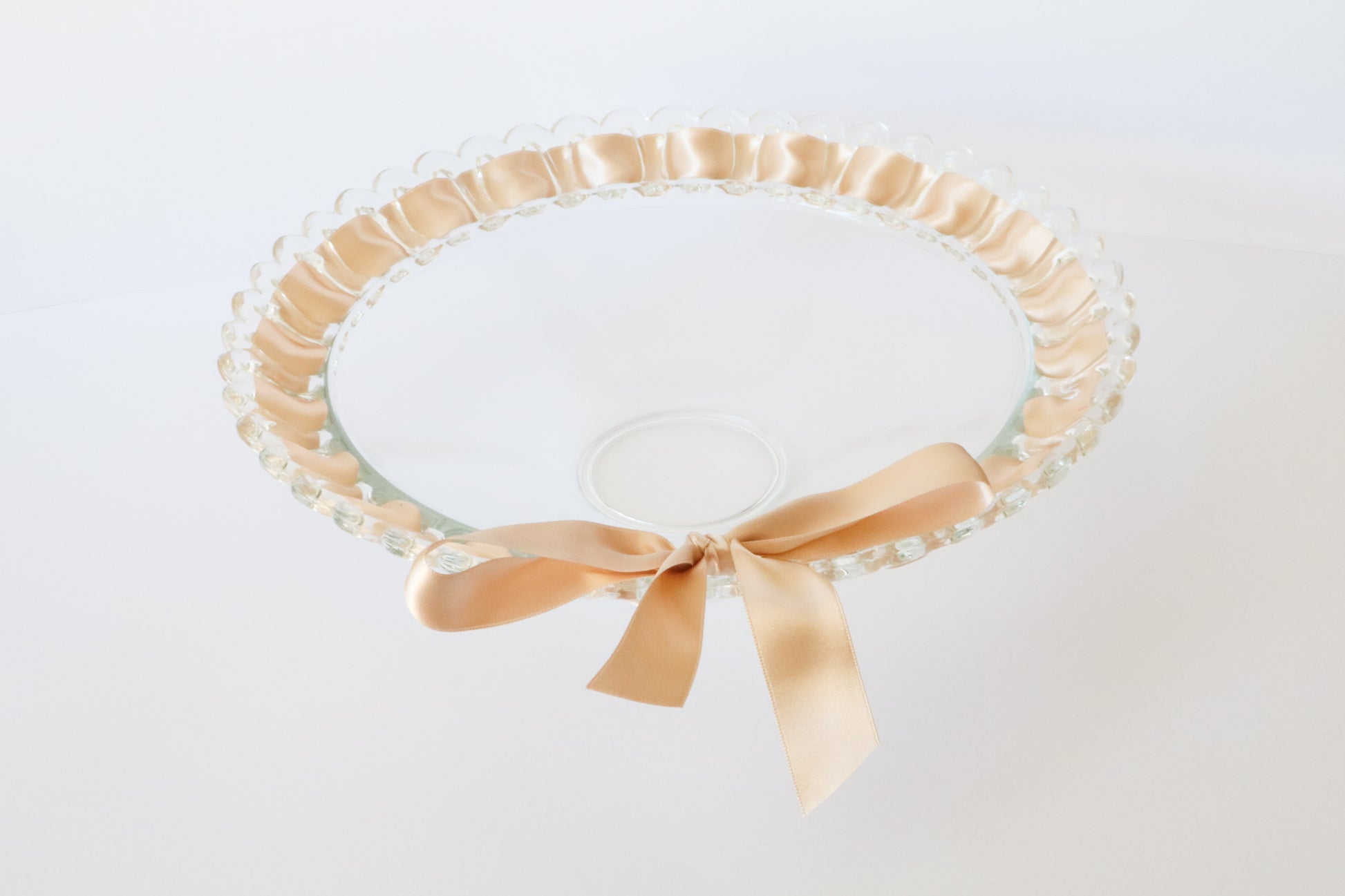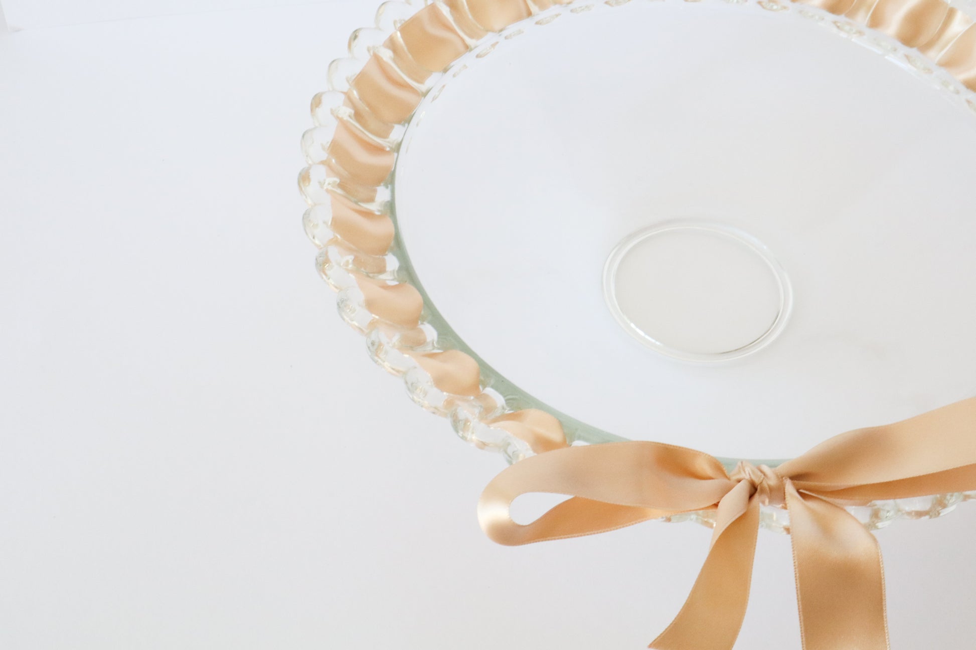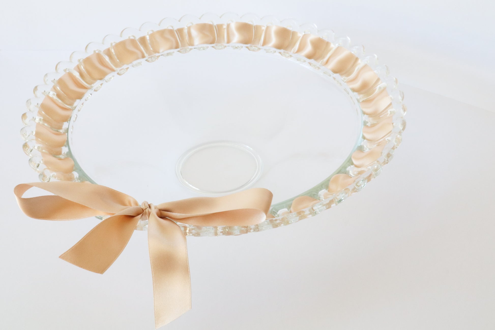 Mooie ronde schaal met een rand van champagne satijnlint.