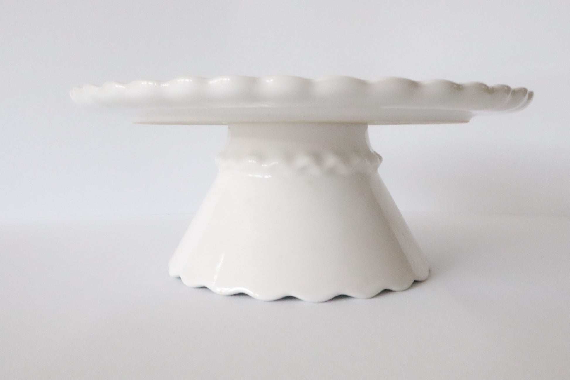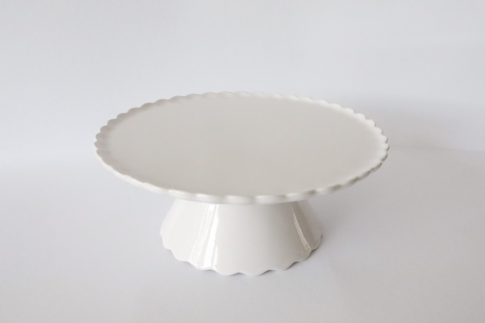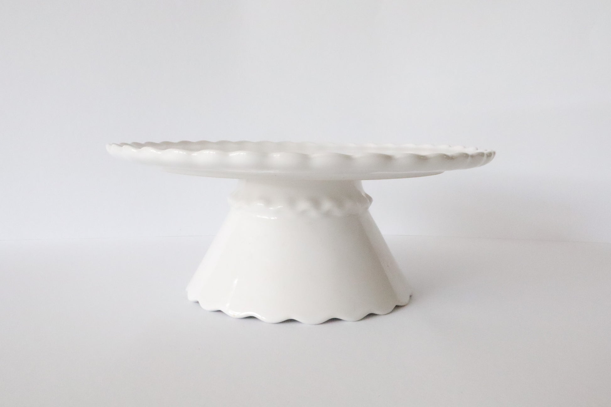 Witte taartplateau met gegolfde rand en brede voet.